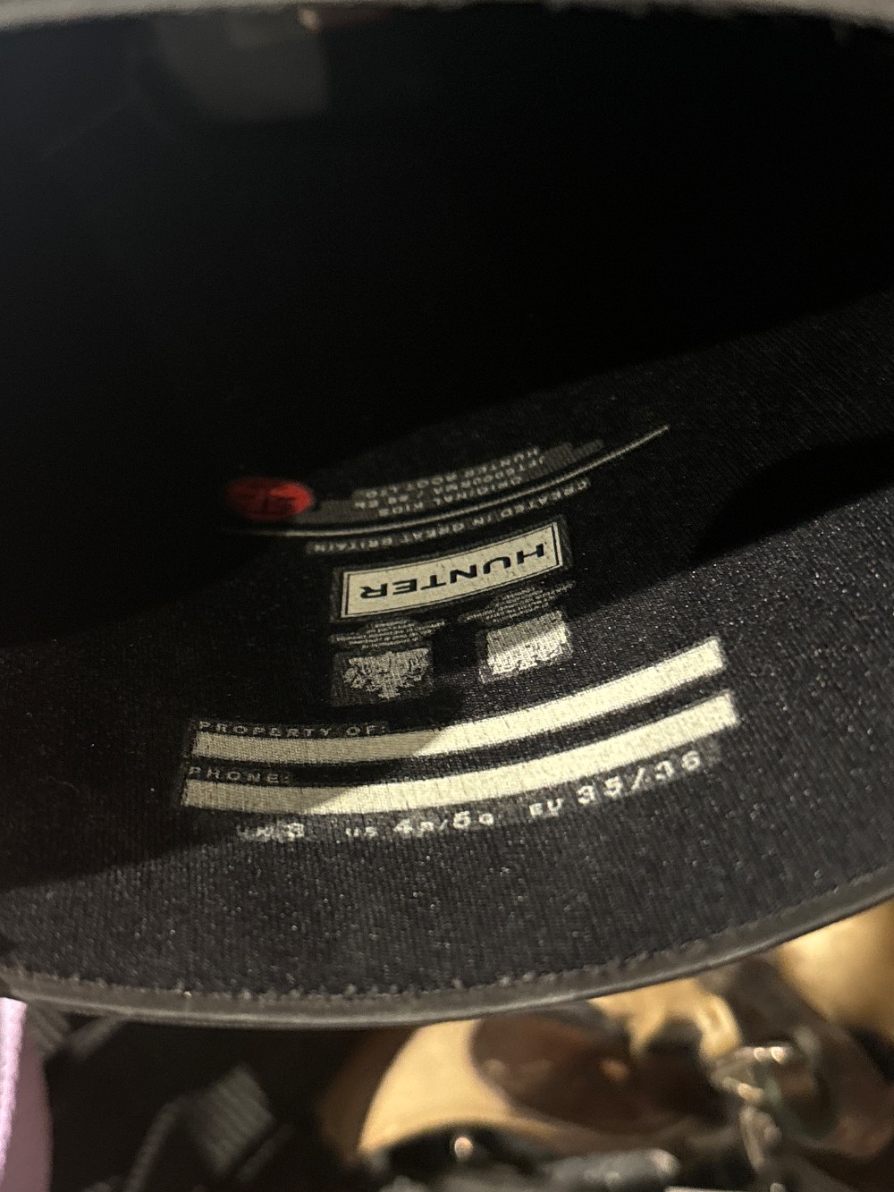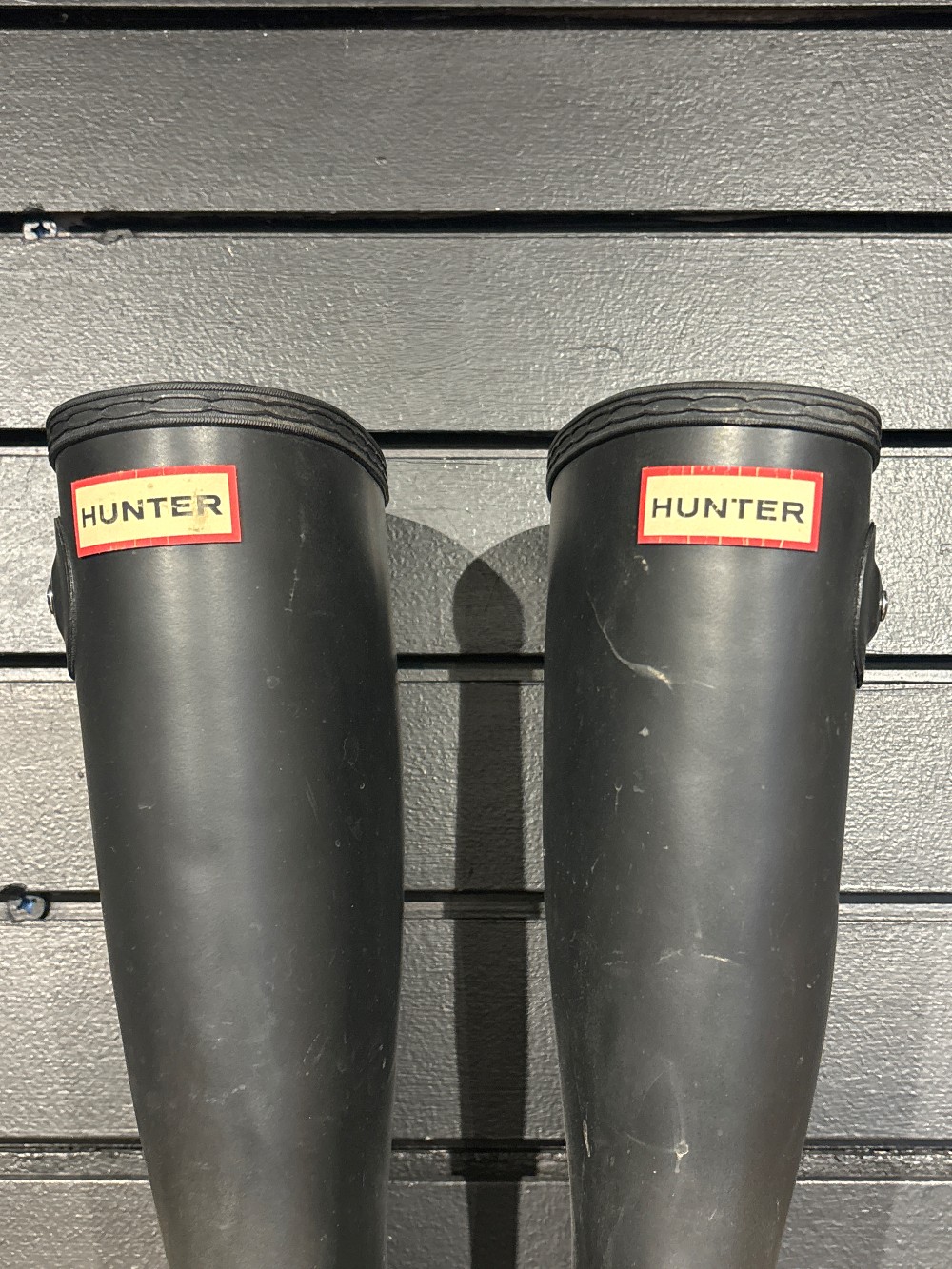Kids matte black Hunter original tall rubber boots with exterior buckle, boys size 4 or girls size 5, in excellent condition.