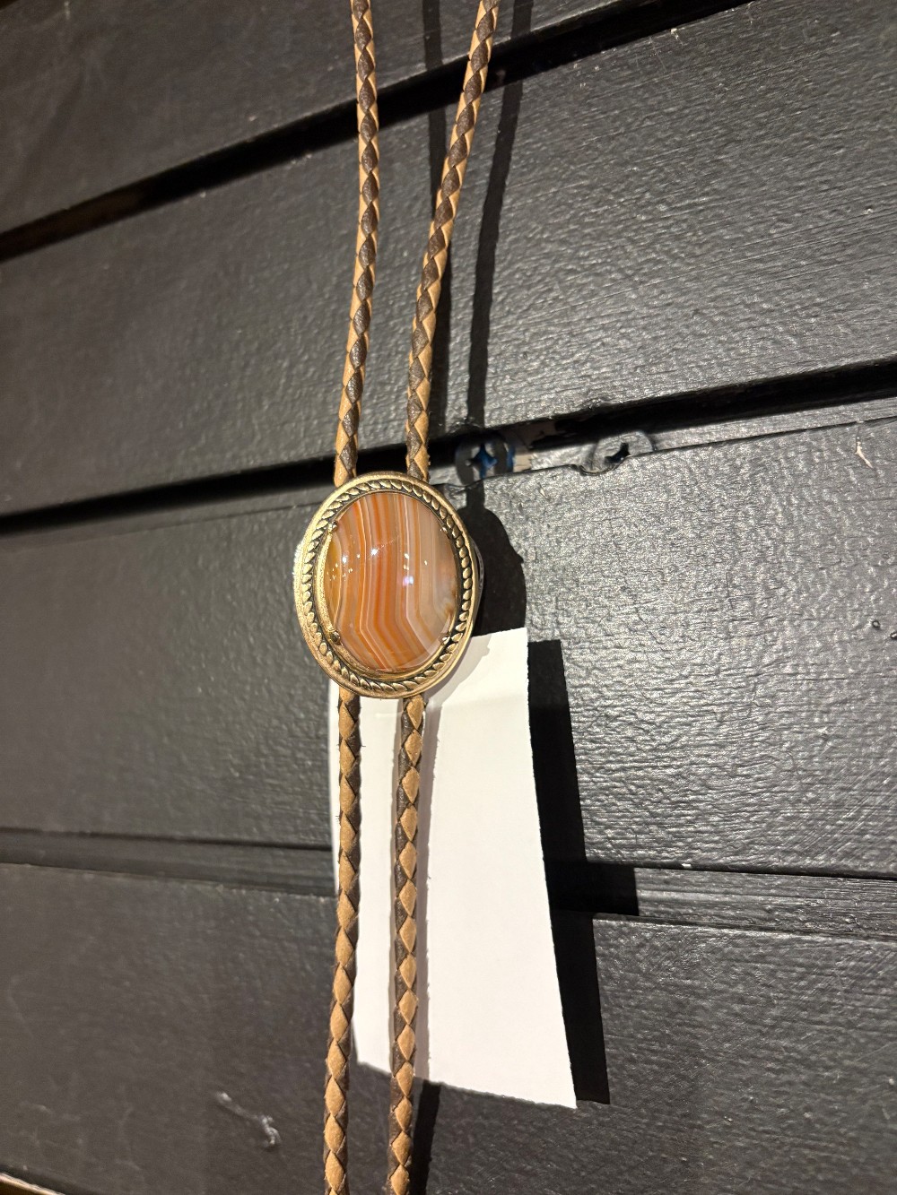 Brown braided leather bolo tie with orange gemstone center, in very good condition.