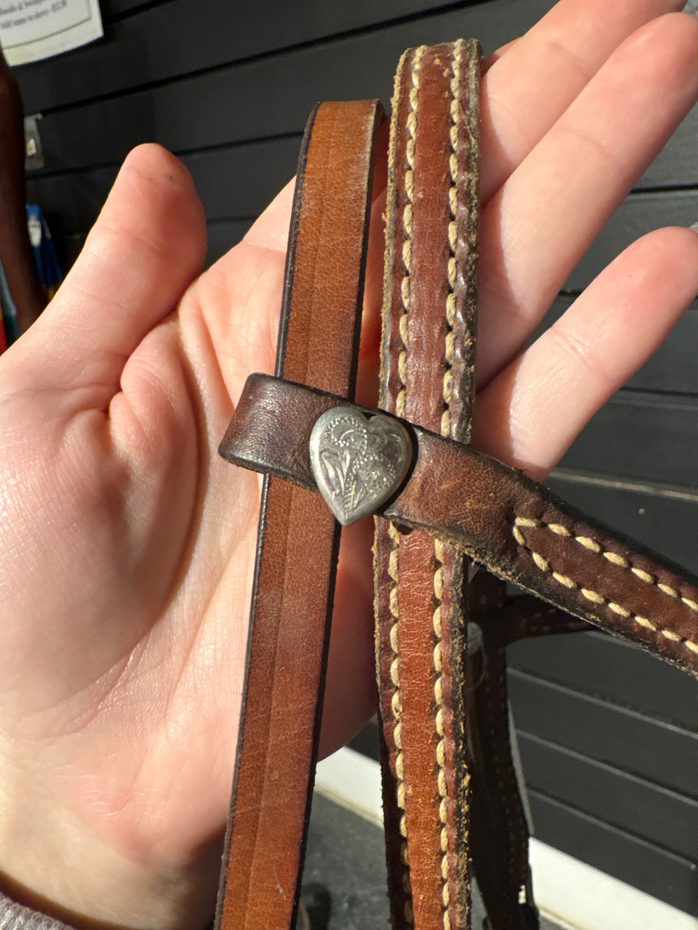 Brown leather western headstall, full size in good used condition. Throatlatch has been replaced with different leather.
